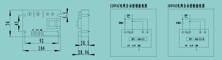 注:①②為輸出端,即梭塊內(nèi)部可控硅的兩個(gè)極,無(wú)極性要求:半波輸出模塊內(nèi)部,單相可控硅的陽(yáng)極接①,陰極接② 端。③④為模塊內(nèi)部同步變壓器初級(jí),有220VAC和380VAC兩種規(guī)格;220VAC檔的輸入電壓為165VAC-260VAC; 380VAC檔的輸入電壓為285VAC-420VAC; ③④無(wú)極性要求。COM為模塊內(nèi)部地,CON為控制端,+5V為內(nèi)部輸出輔助電 源,只供電位器手動(dòng)調(diào)節(jié)控制時(shí)用。①②③④的強(qiáng)電部分和+5V、CON、COM的弱電控制信號(hào)端全隔離。直流5A以上需加散熱器10A以上需加風(fēng)冷或水冷,檔選取外接控制信號(hào)時(shí),CON接正,COM接負(fù);如極性相反則輸出端失控(全開或全)。